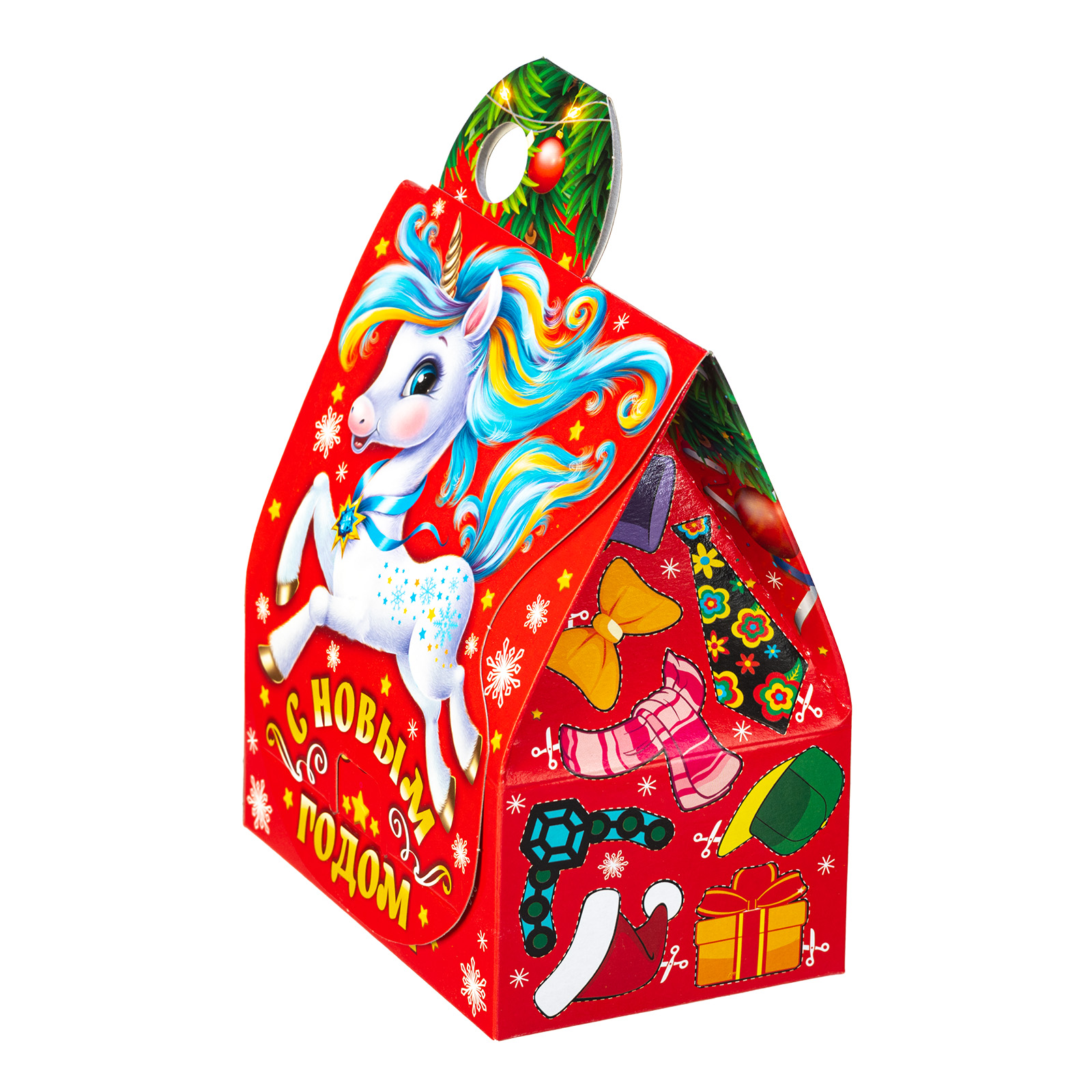 Ищете небольшой, но при этом очень вкусный сладкий подарок для детского праздника? У нас есть для вас предложение! Набор “Сказки лошадки” - это то, что гарантированно вызовет восторг у маленького сластены. Это небольшая картонная коробочка в форме уютного домика с удобной ручкой сверху. Фон упаковки - празднично красный, на нем со всех сторон присутствуют узнаваемые новогодние рисунки: снежинки, салют, елочные шарики, а на передней части главное украшение - иллюстрация в виде маленького сказочного единорога с разноцветной волшебной гривой. Внутри подарка находятся вкусные отборные сладости под любые предпочтения маленького сластены, а также небольшой памятный сувенир.