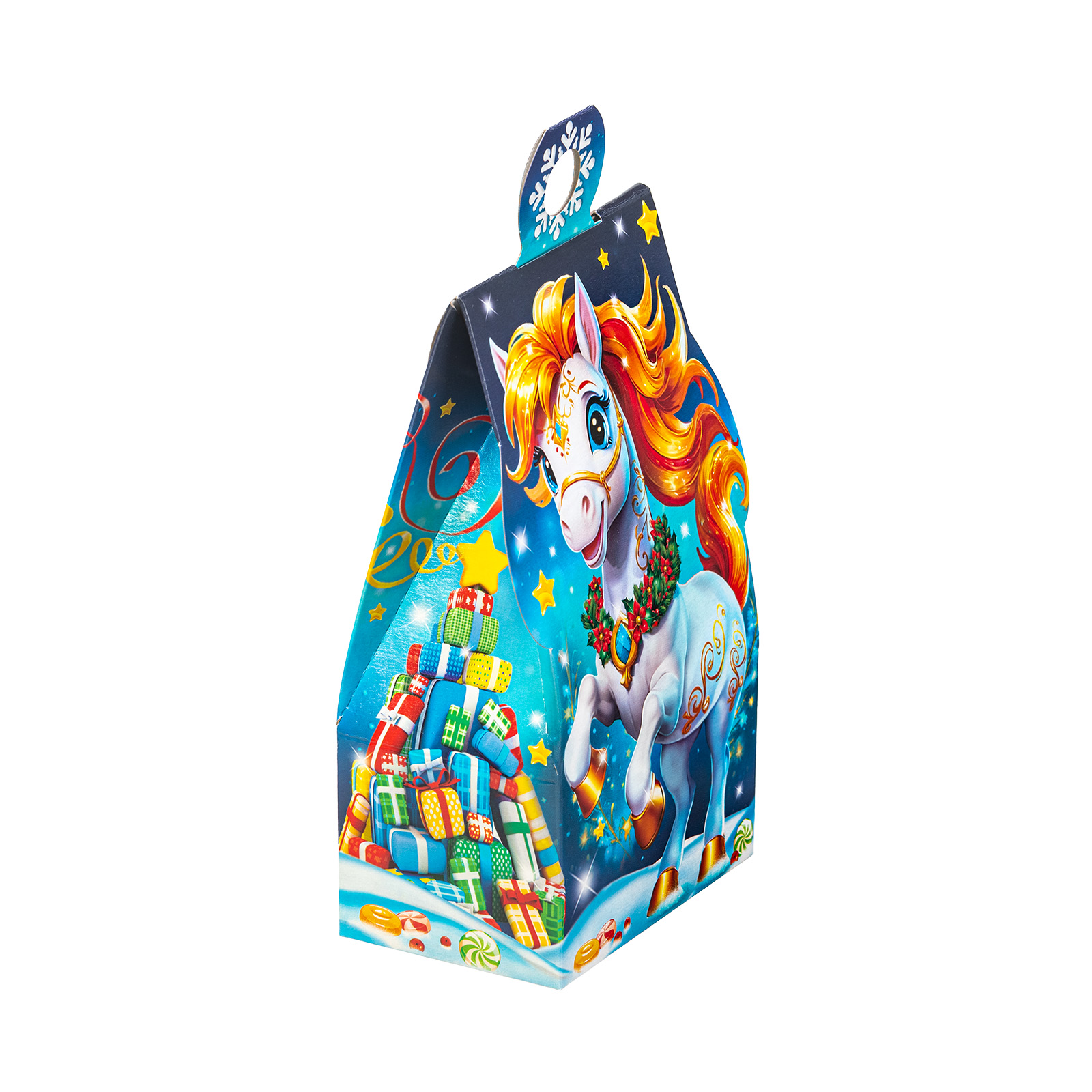 Этот небольшой подарочный набор в красочной картонной упаковке - самая настоящая находка! Упаковка выполнена в виде небольшой сумочки, украшенной яркой новогодней иллюстрацией. Спереди мы видим неутомимую игривую лошадку, которая прискакала из своей волшебной страны и привезла с собой множество угощений для своих друзей. В состав подарка входит 400 грамм отборных сладостей, которые порадуют абсолютно любого ребенка. Этот подарочный набор идеально подойдет для новогоднего мероприятия в начальной школе или детском саду.